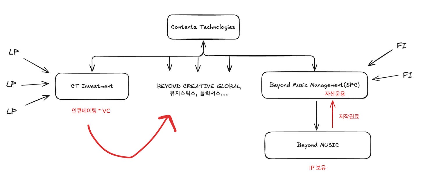 비욘드뮤직의 특별함은 그들의 모회사, 바로 컴퍼니빌더 콘텐츠테크놀로지스에 있습니다. 콘텐츠테크놀로지스는 IP 저작권료에서 나오는 안정적인 현금 흐름을 바탕으로 펀드를 조성하고, 이를 통해 새로운 회사를 설립하고 육성하는 똑똑한 컴퍼니 빌딩 구조를 현실로 만들어가고 있습니다. 즉, 콘텐츠와 IP를 중심으로 자회사를 만들고, 거기서 발생하는 수익으로 또 다른 유망 스타트업에 투자하며 생태계를 확장하는 선순환 구조를 구축한 것입니다.