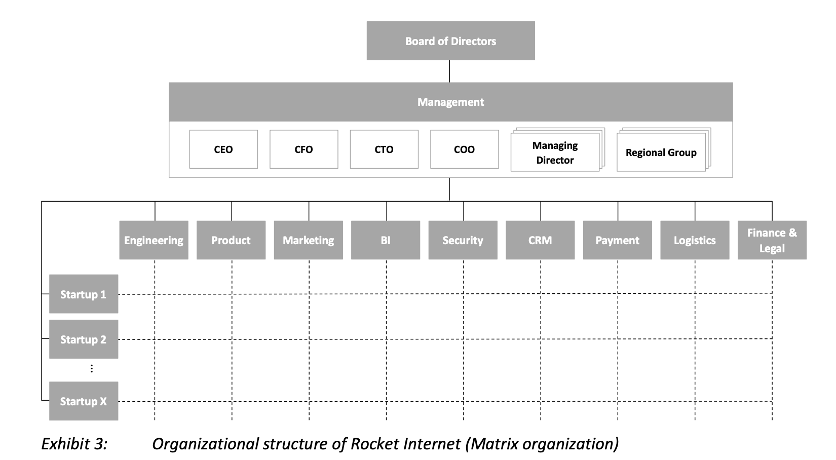하나의 사업체를 운영하는 조직도 관리하기 어려운데 다양한 사업체의 조직을 어떻게 효율적으로 관리할 수 있을까, 이하는 글로벌 컴퍼니빌더들이 주로 사용하는 조직구조 입니다. Functional Organization(50인 미만)은 기능조직에 대한 보고체계를 Matrix Organization(50인 이상)은 각각의 스타트업과 기능조직에 대한 보고체계를 갖습니다. 두 구조의 차이는 자원을 얼만큼, 어떻게 할당하는가에 따른 차이이며, 자원이 적은 조직은 개인이 가져가야하는 부담이 증가하며, 의사결정권이 중앙으로 모이는 경향이 있습니다.