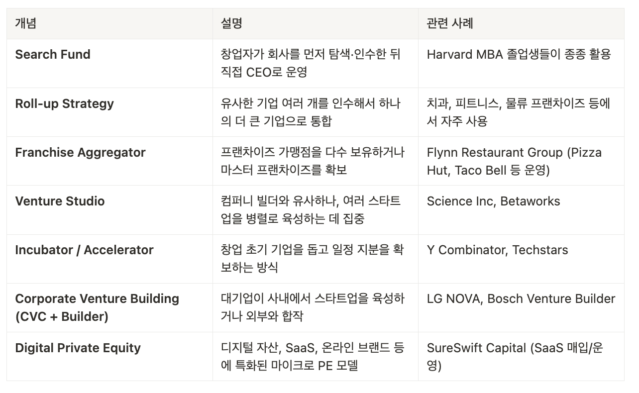Brand Aggregator, Micro PE, Company Builder 그나마 대중적인 것이 요 세 가지인 것 같습니다. 이 중 Company Builder는 패트스트랙아시아 박지웅 대표님의 EO 영상을 통해 사람들이 많이 관심 갖게 된 주제입니다. 이번 뉴스레터에서는 컴퍼니빌더, 홀딩스 모델, 회사를 만드는 회사에 대해 알아보겠습니다.